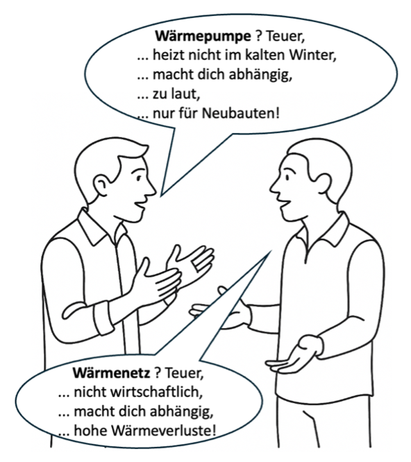 „Wärmenetze haben hohe Wärmeverluste“: Bei älteren Wärmenetzen treten bei Leitungstransporten über größere Distanzen relevante Wärmeverluste auf. Bei modernen Wärmenetzen sind die Verluste zwar ebenfalls vorhanden, aber deutlich geringer, da heute bessere Isolationsmaterialien und -techniken zur Verfügung stehen. Zudem kann die Gesamt-Energiebilanz (unter Einbeziehung auch der Herstellungsaufwände) von z. B. einer Großwärmepumpe in einer Heizzentrale des Wärmenetzes besser sein als bei der Summe vieler dezentraler Wärmepumpen.